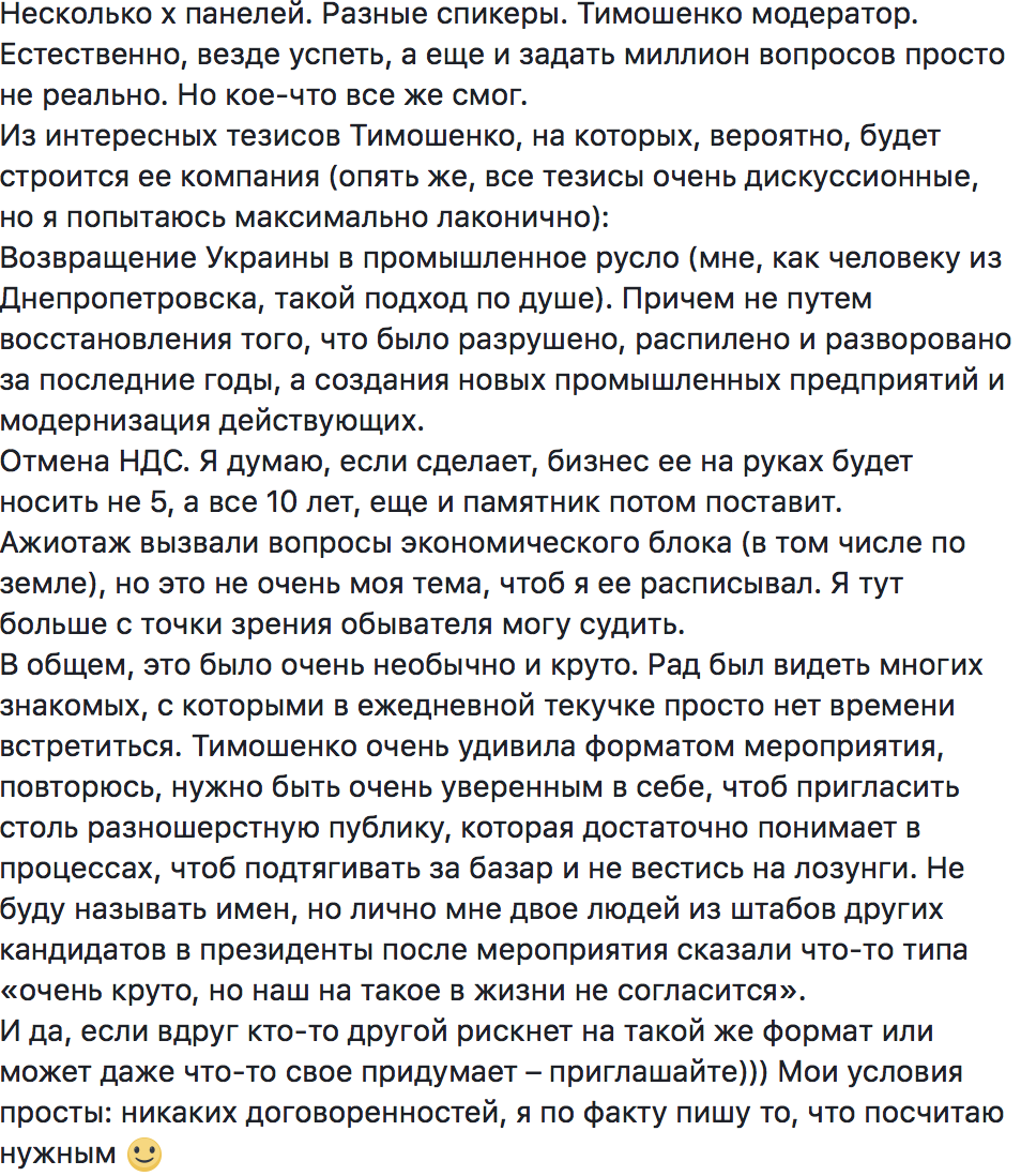 "ЮВТ создала новый политический тренд. Собирать на подобные мероприятия не лояльную тусовку, а самую разношерстную, но по-своему авторитетную. Были и порохоботы, были ЛОМы, очень много политтехнологов (часть из которых работает на конкурентов), активисты. Тут Тимошенко сразу убила несколько зайцев: во-первых, она поставила планку. Только сильный и уверенный в себе политик может приглашать в гости идейных оппонентов. Кто не может, те ей просто не конкуренты. Это было очень показательно. Я вот не представляю, чтоб, например, Порошенко позволил ему задавать столько неудобных и явно ранее не согласованных вопросов.