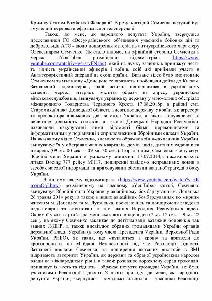Так, 30 декабря Мосийчук на своей странице в Facebook обнародовал текст депутатского обращения, направленного им накануне в ГПУ, СБУ и МВД. В нем он потребовал привлечь Семченко к уголовной ответственности за госизмену (ст.111 УК Украины) и попытку совершения госпереворота (ст.109 УК Украины).