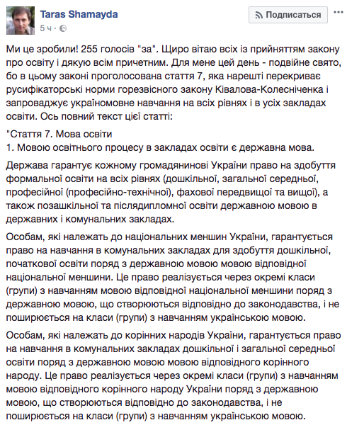 Интересно, что принимая в целом весь текст законопроекта, депутаты утвердили и одну поправку, которая не была отдельно проголосована в сессионном зале. Речь идет о поправке 814, которая дает право начать административное преследование педагогов, которые будут уничижительно отзываться об украинских символах или самом государстве. Данную поправку внес депутат от БПП Олег Мусий.