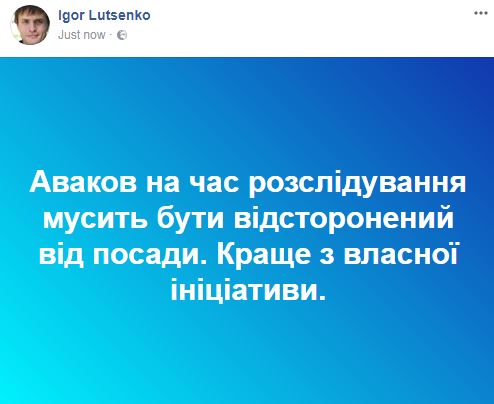 "Аваков на время расследования должен быть отстранен от должности. Лучше по собственной инициативе", - пишет нардеп.
