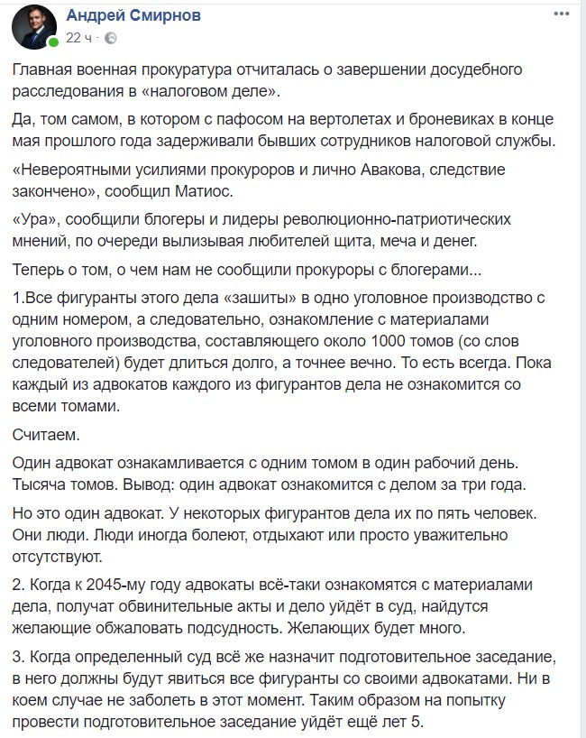 "Все фигуранты этого дела «зашиты» в одно уголовное производство с одним номером, а следовательно, ознакомление с материалами уголовного производства, составляющего около 1000 томов (со слов следователей) будет длиться долго, а точнее вечно. То есть всегда. Пока каждый из адвокатов каждого из фигурантов дела не ознакомится со всеми томами. Считаем. Один адвокат ознакамливается с одним томом в один рабочий день. Тысяча томов. Вывод: один адвокат ознакомится с делом за три года. Но это один адвокат. У некоторых фигурантов дела их по пять человек. Они люди. Люди иногда болеют, отдыхают или просто уважительно отсутствуют", - поясняет адвокат на своей странице в Facebook.