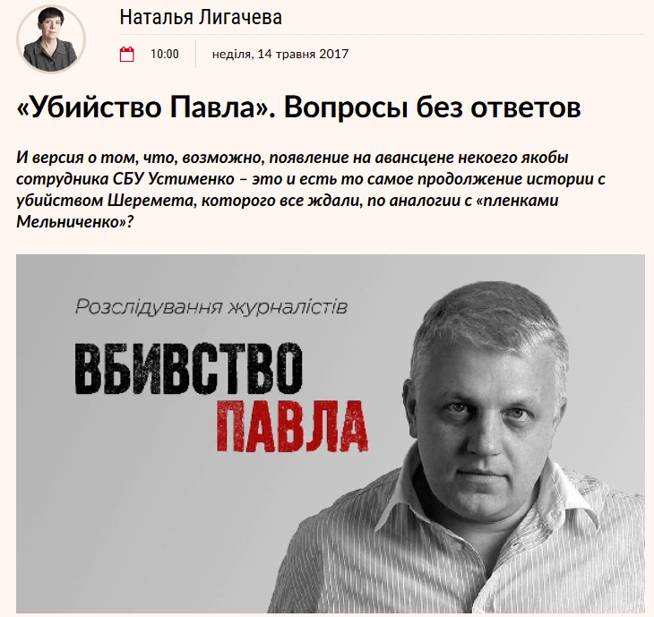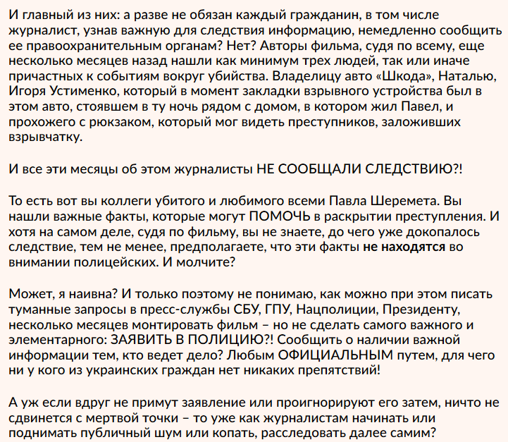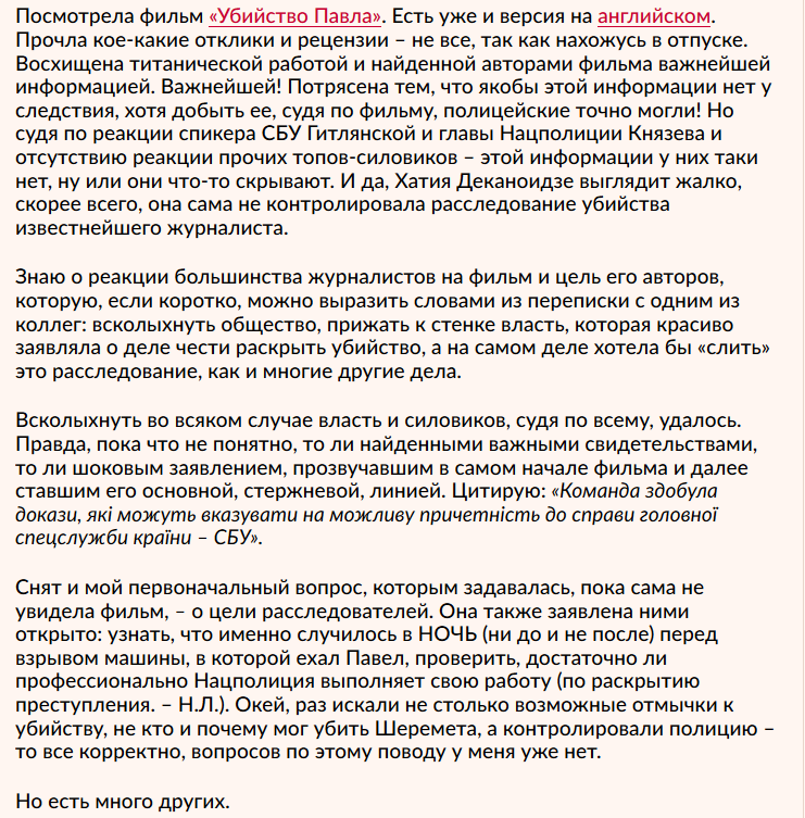 Как, например, случилось после колонки Лигачевой о расследовательском фильме "Слідство.Інфо" об убийстве Павла Шеремета. Лигачева и тут критикует, делая вывод: если журналисты собрали новые улики по делу, они должны были не фильмы об этом снимать, а сообщить в правоохранительные органы.