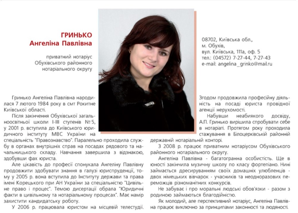 Гринько по образованию юрист, и уже десять лет оказывает услуги в сфере нотариата. Именно на Ангелину оформлено большинство активов, указанных в декларации Олега Вовчка. Прежде всего, это жилой дом площадью 289 м2, а также несколько крупных участков земли суммарной площадью около 1 га на территории элитных районов Киевской области и небольшой надел на территории Голопристанского района Херсонщины.