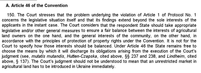 Многие украинские СМИ поспешили сообщить, что ЕСПЧ признал земельный мораторий в Украине противоречащим Конституции и законам. Это не так: в п.107 своего решения суд указал, что мораторий соответствует требованиям законности, установленным в Протоколе №1 к Конвенции по правам человека: