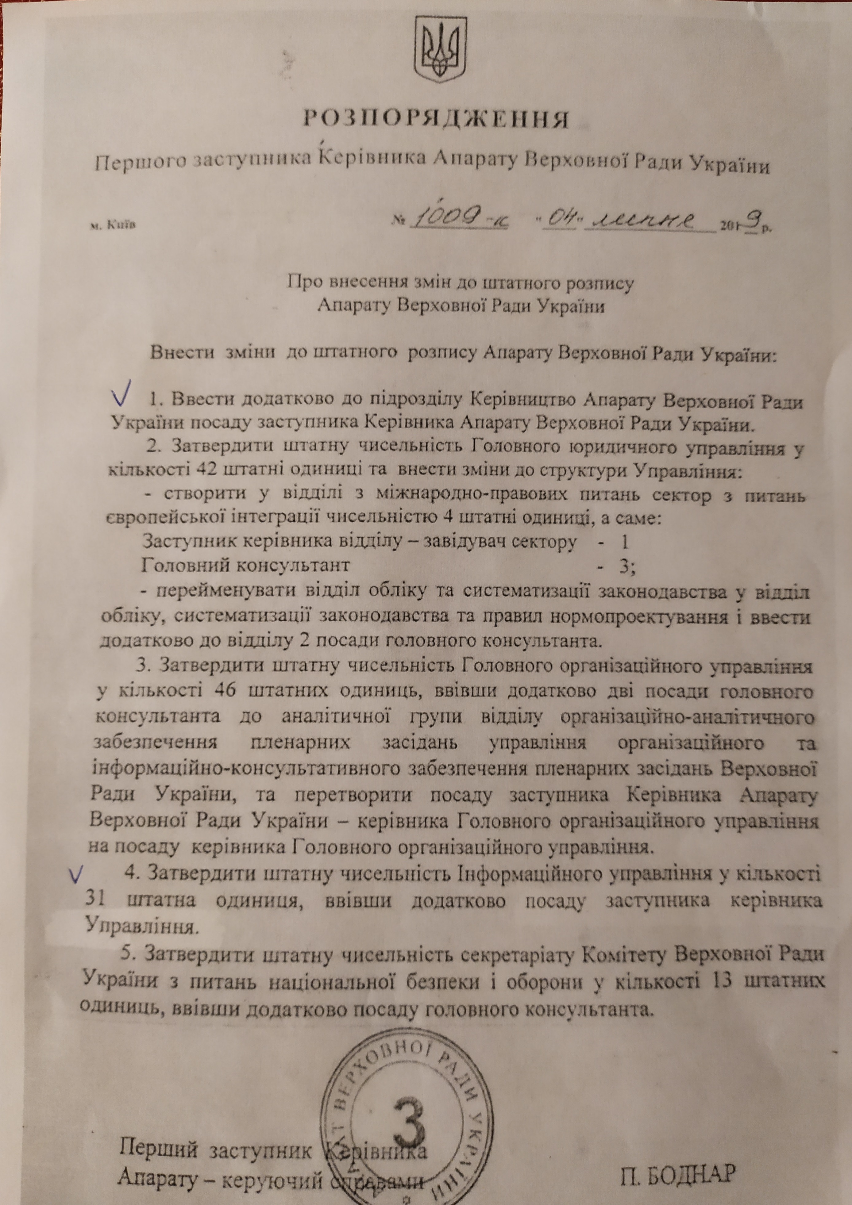 В работе с кадрами руководство аппарат Рады применяет и коллективный метод. Как свидетельствуют документы, по распоряжению управделами Бондара затеяли переезд отделов организационного обеспечения деятельности руководства парламента. Сейчас эти подразделения находятся в здании самой Верховной Рады по ул. Грушевского, 5. Однако решено переселить их в помещения парламентских комитетов по ул. Садовой.