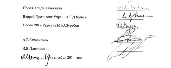 Меморандум подписали Посол ОБСЕ Хайди Тальявини, представитель Украины Леонид Кучма, посол России в Украине Михаил Зурабов и представители "ДНР" и "ЛНР" Александр Захарченко и Игорь Плотницкий.