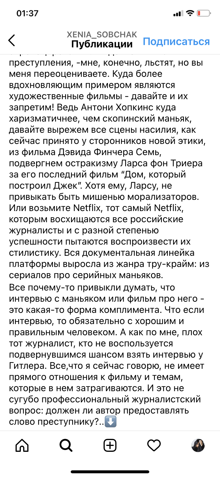 И добавила: "Разговоры о том, что фильм Ксении Собчак про маньяка может кого-то спровоцировать или вдохновить на преступления, мне, конечно, льстят, но вы меня переоцениваете. Куда более вдохновляющим примером являются художественные фильмы".