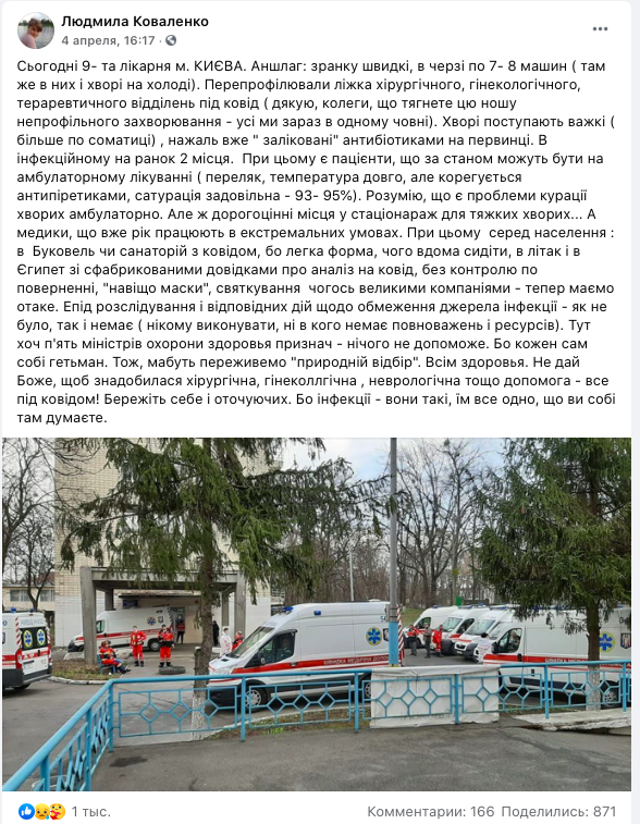 Очередь из "скорых" под одной из киевских больниц, спровоцированная британским штаммом коронавируса. Фото: Людмила Коваленко, Фейсбук