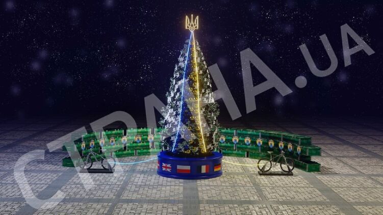 Нижняя часть елки будет оформлена стендами с флагами стран, которые помогали Киеву справиться с вызовами и последствиями войны.