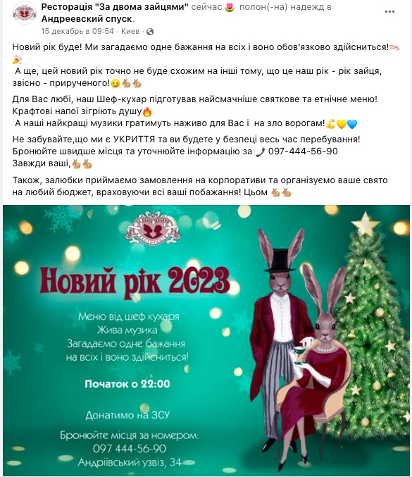 Также предлагает отметить у них Новогоднюю ночь ресторан "За двумя зайцами" в Киеве. Обещают живую музыку, праздничное этничное меню, и напоминают, что у них есть укрытие на случай воздушной тревоги.