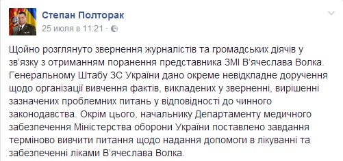 Известно, что участие к судьбе журналиста ранее пообещал проявить глава Минобороны Степан Полторак. Три недели назад в своем Facebook он написал, что дал задание начальнику Департамента медобеспечения ведомства изучить вопрос по оказанию помощи в лечении и обеспечении Волка медпрепаратами.