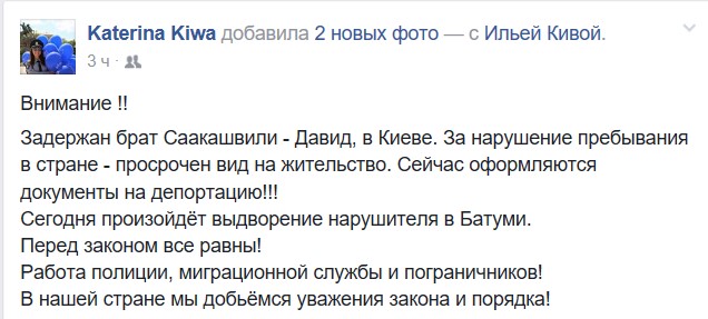 "Задержан брат Саакашвили – Давид, в Киеве. За нарушение пребывания в стране – просрочен вид на жительство. Сейчас оформляются документы на депортацию!", - написала Кива.