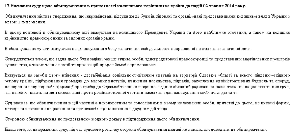 Тогда суд просто "размазал по стенке" все проведенные следственные действия. В тексте приговора имеются совершенно уничтожающие формулировки в адрес правоохранителей. Например "лирику" о вине в одесской трагедии предыдущего руководства страны суд отмел следующим образом: