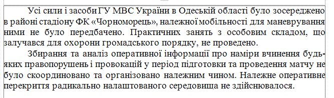 Все силы и средства ГУ МВД Украины в Одесской области были сосредоточены в районе стадиона ФК "Черноморец", и надлежащей мобильности для маневрирования предусмотрено не было. Практические занятия с личным составом, который привлекался для охраны общественного порядка, не проводились. Надлежащее оперативное перекрытие радикально настроенной среды не осуществлялось. Об этом говорится в уже упомянутом отчете следственной комиссии Верховной Рады: