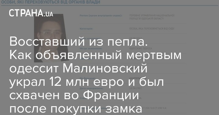 Таланты мужчины, который в Украине пытался инсценировать свою смерть, чтобы уйти от ответственности, французы также оценили по достоинству. В сообщении Европола Малиновского называют "королем замка" - международным мошенником высокого уровня, причастным к отмыванию денег на территории ЕС.