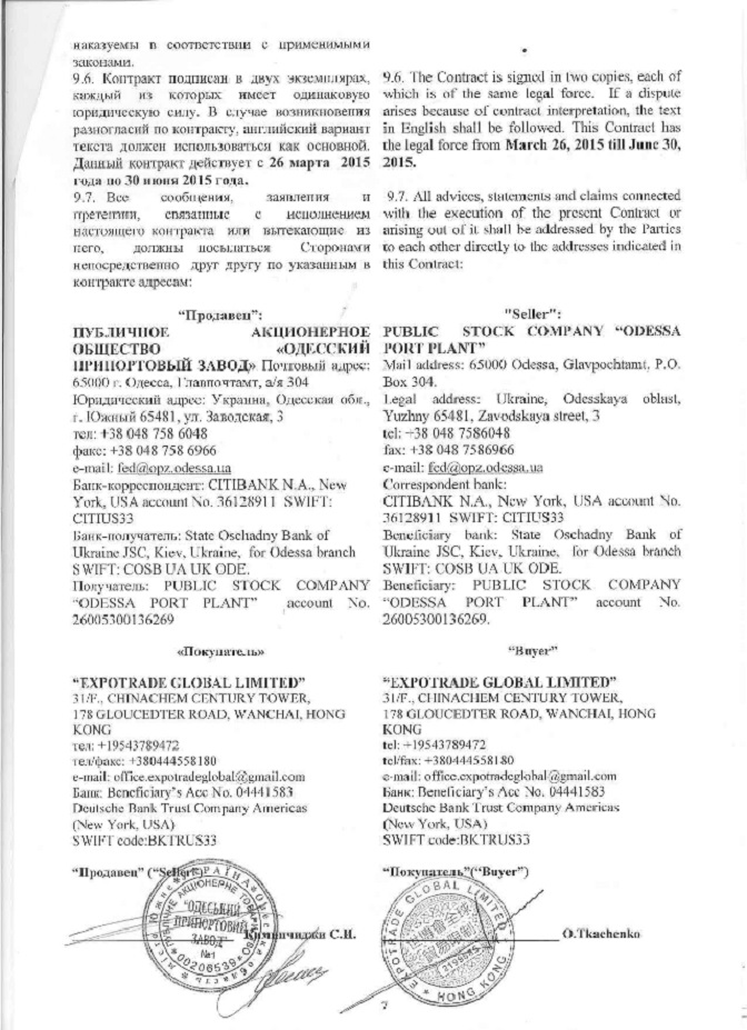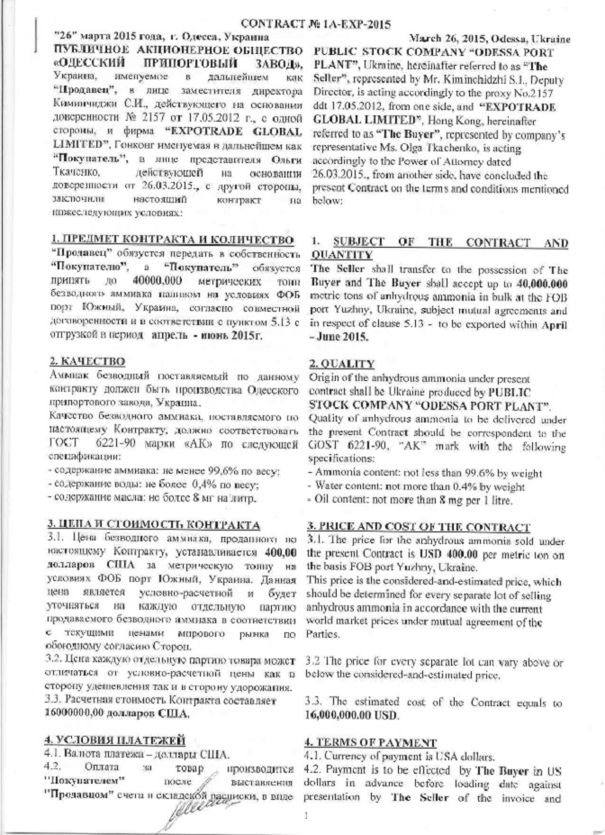 Тогда же выяснилось, что буквально за месяц до подписания договора Dreymoor Fertilizers с белизской Expotrade Global (в марте 2015 года) Одесский припортовой завод подписал с одноименной компанией Expotrade Global (но уже с регистрацией в Гонконге) два договора на поставку 60 тыс. тонн карбамида и 40 тыс. тонн аммиака.