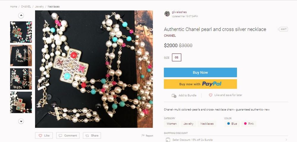 Мы рассмотрели у Валерии жемчужную нить с крестом и логотипом Сhanel. Регулярная цена именно такой – $3000, но так как модель не новая, то приобрести в интернете ее можно и на тысячу долларов дешевле.