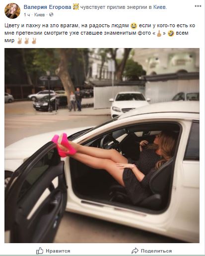 Чуть позже она, видимо, отреагировав на ситуацию, написала пост и прикрепила фото, где она высунула ноги из машины.