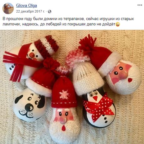 "В прошлом году были домики из тетрапаков, сейчас игрушки из старых лампочек, надеюсь, до лебедей из покрышек дело не дойдет", - шутит Ольга.