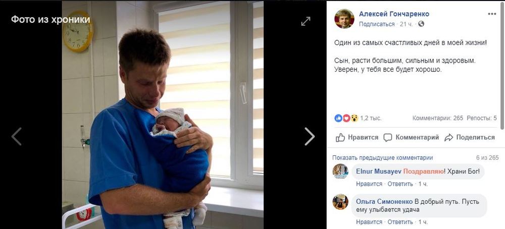 "Один из самых счастливых дней в моей жизни! Сын, расти большим, сильным и здоровым. Уверен, у тебя все будет хорошо", - написал Гончаренко и выложил фото с младенцем.