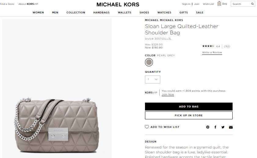 Сумочка из стеганной кожи сейчас на официальном сайте продается со скидкой. И если раньше она стоила $328, то сейчас ее можно заказать за $190 (5234 гривен).