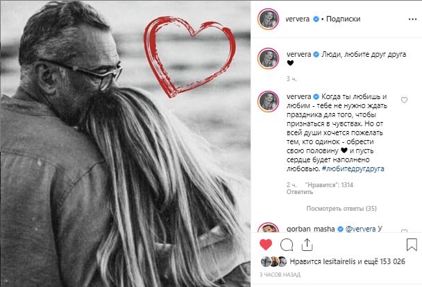 "Люди, любите друг друга. Когда ты любишь и любим - тебе не нужно ждать праздника для того, чтобы признаться в чувствах. Но от всей души хочется пожелать тем, кто одинок - обрести свою половину и пусть сердце будет наполнено любовью", - подписала фото Брежнева.