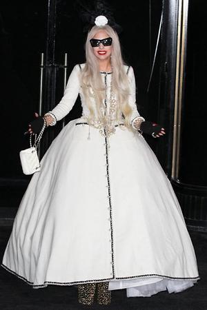 Певица Леди Гага регулярно надевает что-то, созданное в мастерской Карла Лагерфельда. На одном из своих концертов она удивила поклонников новым образом. На Леди Гага было длинное белое платье с кринолином, украшенное крупными пуговицами жемчужного цвета и вышивкой контрастного черного цвета.