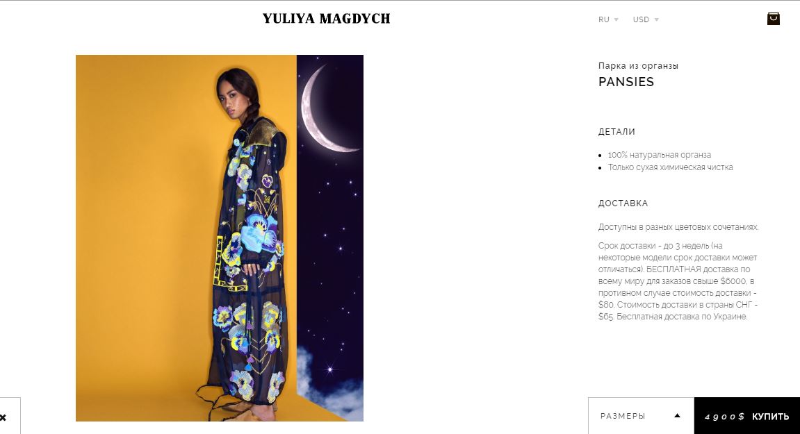Одежда из весенней коллекции 2018 года и называется Рansies (цветы "Анютины глазки" - англ). Парка выполнена из 100% органзы и стоит $4900 или 128 380 гривен по курсу НБУ на 02.07.2019 года.