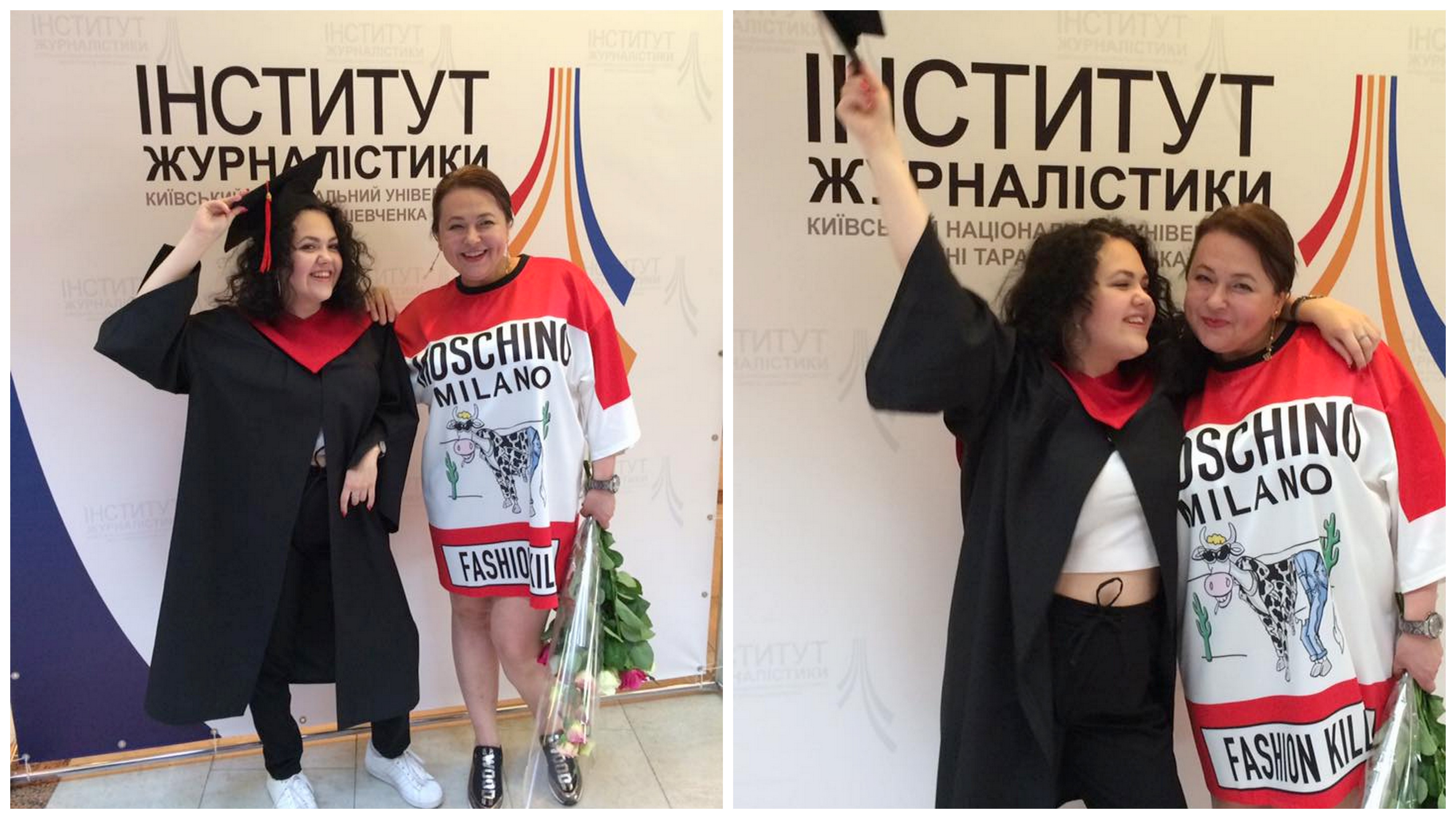Как оказалось, Криворучкина любит одежду модных брендов. На выпуск к дочке она пришла в платье-футболке итальянского бренда Moschino. Вещь с принтом курящей коровы из коллекции 2016 года, но в онлайн магазинах можно еще отхватить и себе экземпляр. Стоит такое $276 или 6970 грн по курсу НБУ на 03.09.2019 года.