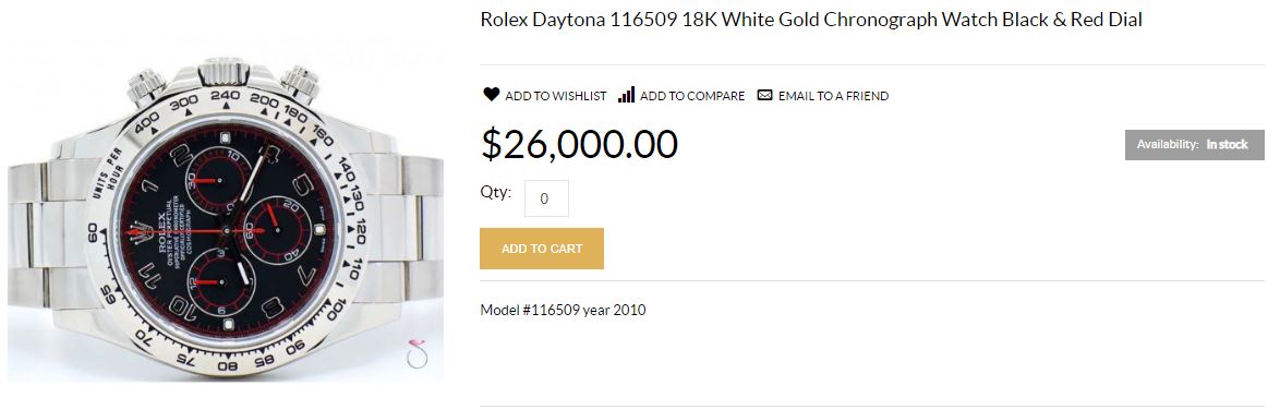 Часы на руке Палицы похожи на Rolex Daytona из 18-каратного белого золота с красной секундной стрелкой и черным циферблатом, на котором расположены три мелких счетчика.