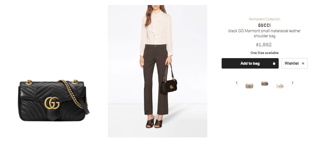 Аксессуар с золотистой фурнитурой GG, съемной цепочкой и кожаным ремешком через плечо. Бесплатно в Украину эта сумка не приедет. Доставка обойдется от $35. Кстати, аксессуары Gucci по популярности на третьем месте после Armani и Prada.