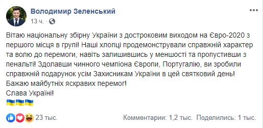 "Поздравляю национальную сборную Украины с досрочным выходом на Евро-2020 с первого места в группе! Наши ребята продемонстрировали настоящий характер и волю к победе, даже оставшись в меньшинстве и пропустив с пенальти! Победив действующего чемпиона Европы, Португалию, вы сделали настоящий подарок всем защитникам Украины в этот праздничный день! Желаю будущих ярких побед!", - написал Зеленский.