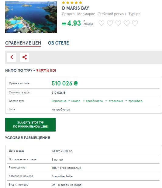 Стоимость тура на 8 ночей в номере с перелетом, страховкой, трансфером и питанием типа "все включено" на пару с ребенком (у Тимошенко есть маленький сын Семен) может доходить до полумиллиона гривен. Вот пример тура с 23 сентября, в Турции как раз бархатный сезон и гостиница, кстати, практически забита.