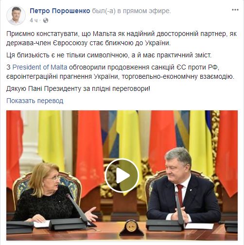 "Приятно констатировать, что Мальта как надежный двусторонний партнер, как государство-член Евросоюза становится ближе к Украине", – подчеркнул Порошенко. По его словам, чрезвычайно важно осуждение Мальтой нарушений прав человека в оккупированном Крыму. Президент также сообщил, что между Украиной и Мальтой вскоре откроется прямое авиасообщение.