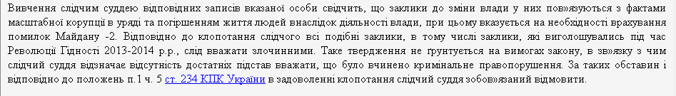 Поэтому, по мнению судьи, "согласно ходатайству следователя, все подобные призывы, в том числе призывы, которые провозглашались во время Революции достоинства 2013-2014 годов, следует считать преступными". По мнению судьи, подобная позиция следствия не основывается на требованиях закона: