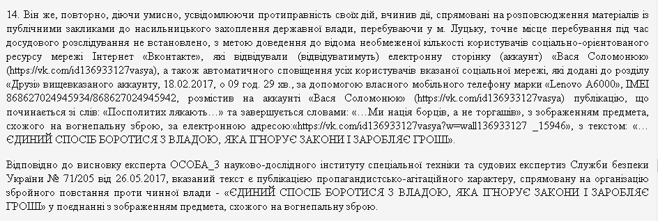 По заключению привлеченного следствием специалиста, здесь содержится прямой призыв к каждому (кто знакомится с данным текстом) к насильственной смене власти и свержению общественного строя в Украине.
