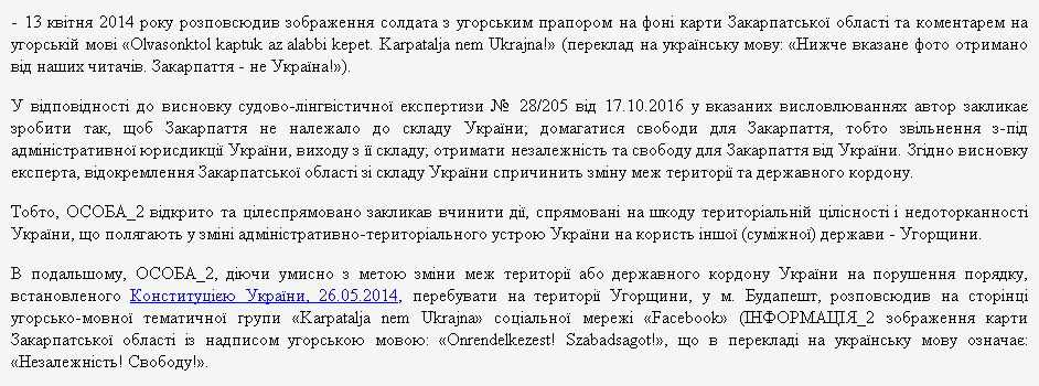 Кроме того, в интервью телеканалу "Россия 1", находясь в Будапеште, 13 июля 2015 года обвиняемый призывал: "Или уехать, или бороться за освобождение Закарпатья от украинской власти!".