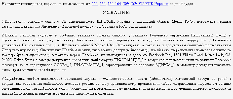 Свою просьбу следователи обосновали тем, что имеющиеся и удаленные сообщения по общению Сергея Самарского с другими пользователями через Facebook-месенджер могут быть связаны с совершенным убийством, в частности, содержать информацию об угрозах, подготовке и совершении убийства. В итоге Лисичанский городской суд удовлетворил ходатайство следователей и затребовал доступ к информации и документам корпорации Facebook: