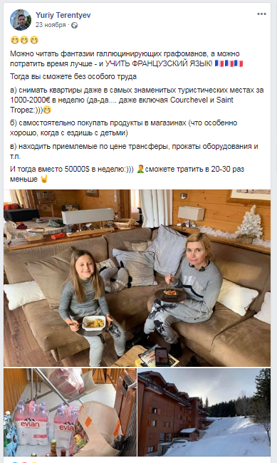 В ответ Юрий Терентьев на своей странице в Фейсбуке назвал выдвинутые обвинения "фантазиями галлюциоинрующих графоманов". Чиновник сообщил, что "благодаря изучению французского языка" можно тратить на отдых в Куршевеле не 50 тыс дол в неделю, а "в 20-30 раз меньше":