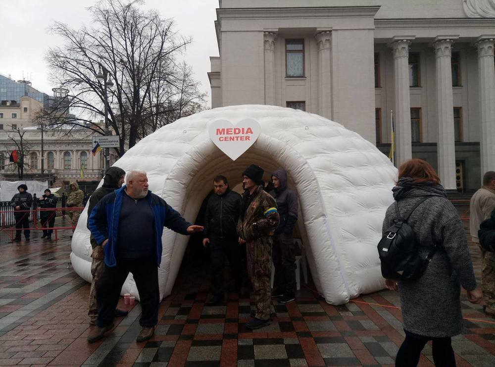 В этой большой белой палатке, напоминающей жилище эскимосов, михомайдановцы разместили переговорный пункт. Почему-то это назвали Медиацентром. Фото: Анастасия Товт, Страна.ua