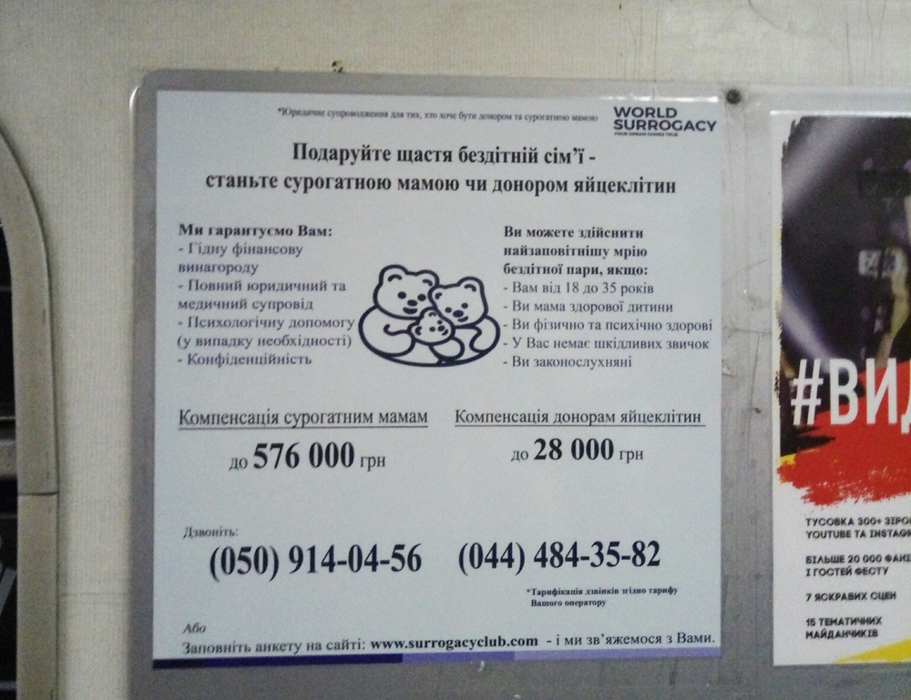 Недавно одно из них, некое World Surrogacy, расклеило такие объявления в киевском метро: "Подарите счастье бездетной семье – станьте суррогатной матерью или донором яйцеклетки". За эти необычные услуги украинкам предлагают немалые вознаграждения.