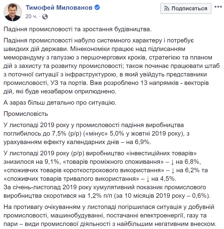 "Падение промышленности приобрело системный характер и требует быстрых действий государства. Минэкономики работает над подписанием меморандума с отраслью из первоочередных шагов, стратегией и планом действий по защите и развитию промышленности; также начинает работать штаб по текущей ситуации с инфраструктурой, в который войдут представители промышленности, УЗ и портов", - сообщил Милованов.