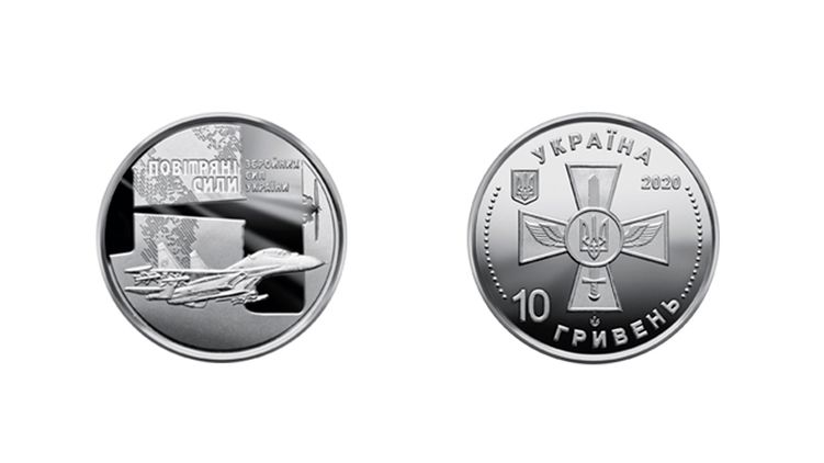 Так, на аверсе новой монеты размещен малый Государственный герб Украины, надпись Украина, год чеканки 2020, эмблема Воздушных сил ВСУ, логотип Банкнотно-монетного двора Национального банка Украины и номинал.