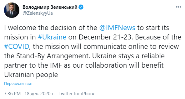 "Я приветствую решение МВФ начать свою миссию в Украине 21-23 декабря. Из-за COVID-19 миссия будет на онлайн-связи для пересмотра соглашения в формате stand-by. Украина остается надежным партнером МВФ, ведь наше сотрудничество принесет пользу украинскому народу", - написал Зеленский в своем Twitter в пятницу.