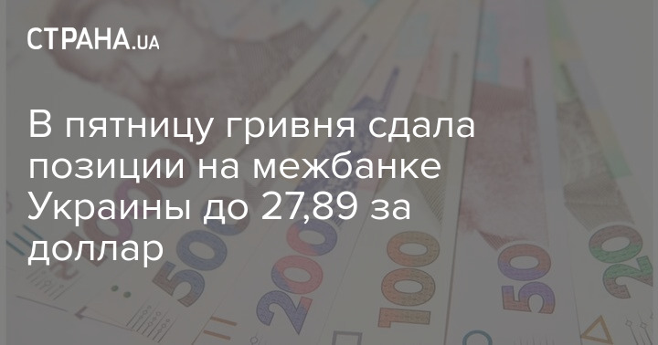 В последний рабочий день недели курс гривни на межбанковском валютном рынке ослабился до 27,89 грн/$1 с 27,77 грн/$1 в предыдущий рабочий день. Котировки нацвалюты на закрытие торгов составили 27,88-27,90 грн/$1. Об этом сообщает "Интерфакс-Украина" со ссылкой на дилеров коммерческих банков.