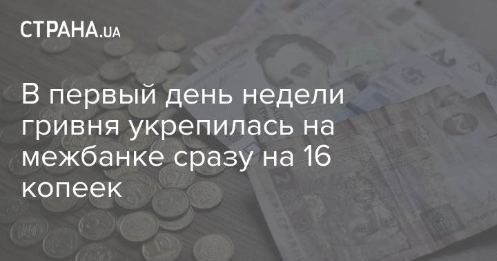 Курс гривни на межбанковском валютном рынке после укрепления в пятницу на 12 копеек в понедельник укрепился на 16 копеек и составил 27,96 гривен за 1 доллар.