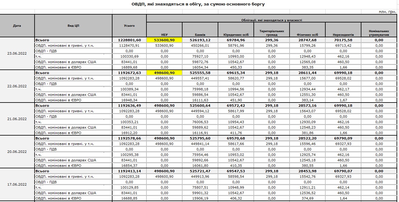 С начала войны эмиссия гривны через ОВГЗ достигла 223,5 млрд грн. Это 17% довоенного госбюджета Украины. Национальный банк выкупал и простые гривневые гособлигации, и военные.
