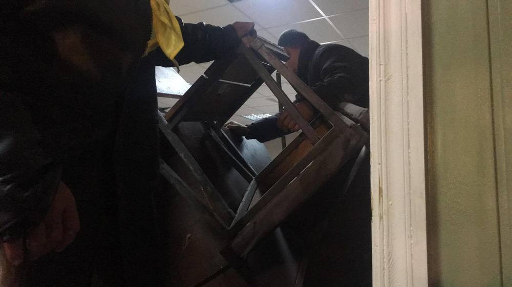 Работники полиции пытались штурмовать здание. В ответ радикалы начали ломать мебель, кусками которой отбивались от полицейских, и бить стекла.
