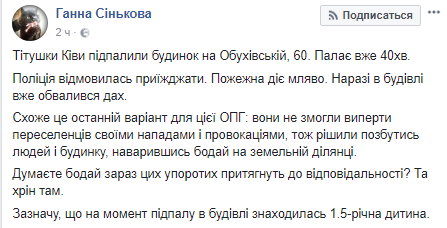 "Титушки Кивы подожгли дом на Обуховской, 60 Горит уже 40мин. Полиция отказалась приезжать. Пожарная действует вяло. Сейчас в здании уже обвалилась крыша", - написала она.