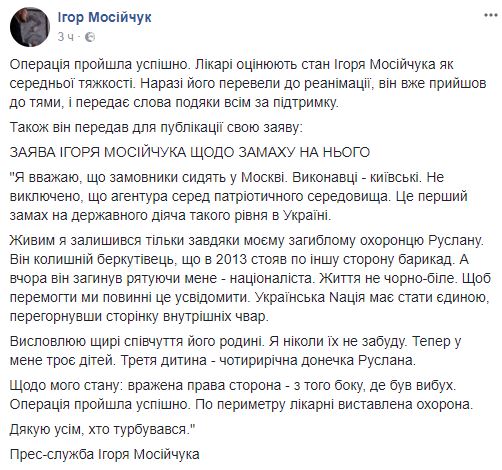 Напомним, Мосийчука ранило вчера вечером при взрыве у здания телеканала Эспрессо по улице Мицкевича, 10/7 в Киеве. Полиция квалифицировала дело как теракт